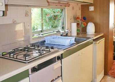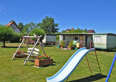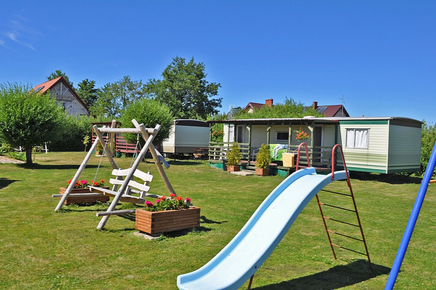 Domek posiada w pełni wyposażony aneks kuchenny (płyta gazowa 4 palnikowa, zastawa stołowa, garnki, patelnie, sztućce, kubki, czajnik bezprzewodowy, lodówka). Dodatkowo grill, parawan, koc plażowy. Przy każdym domku stół i ławy ogrodowe drewniane.